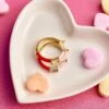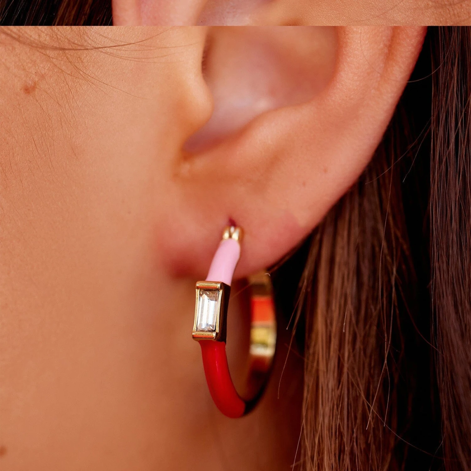 Flirty, fun dimension for every Valentine’s gathering on your calendar this year. These hoops have a smooth, gold-plated finish coated in glossy enamel that meets at a bezel-set, baguette shaped clear glass stone.