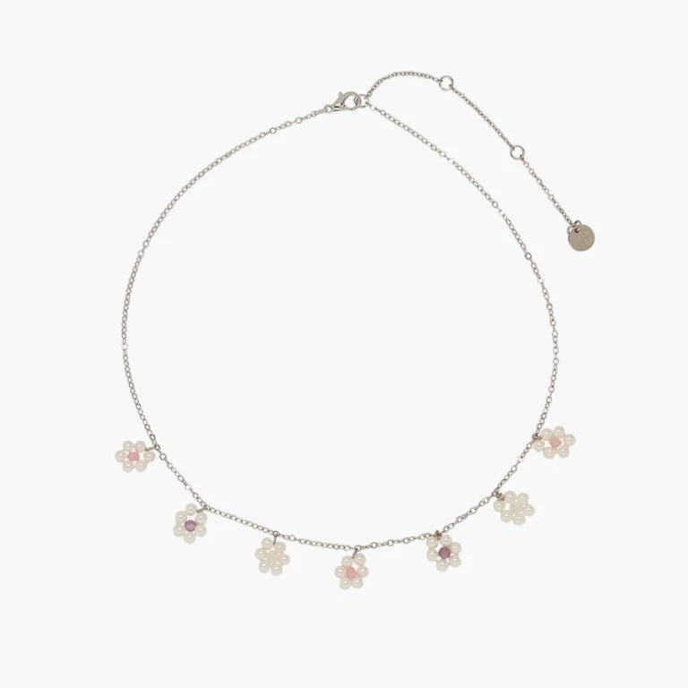 We’re throwing it back to 90s-inspired style with our Bitty Pearl Flower Choker. Set on a delicate silver chain, this too-cute design features a bouquet of dainty pearl flowers, which are accented with faceted opal and glass beads in the center!