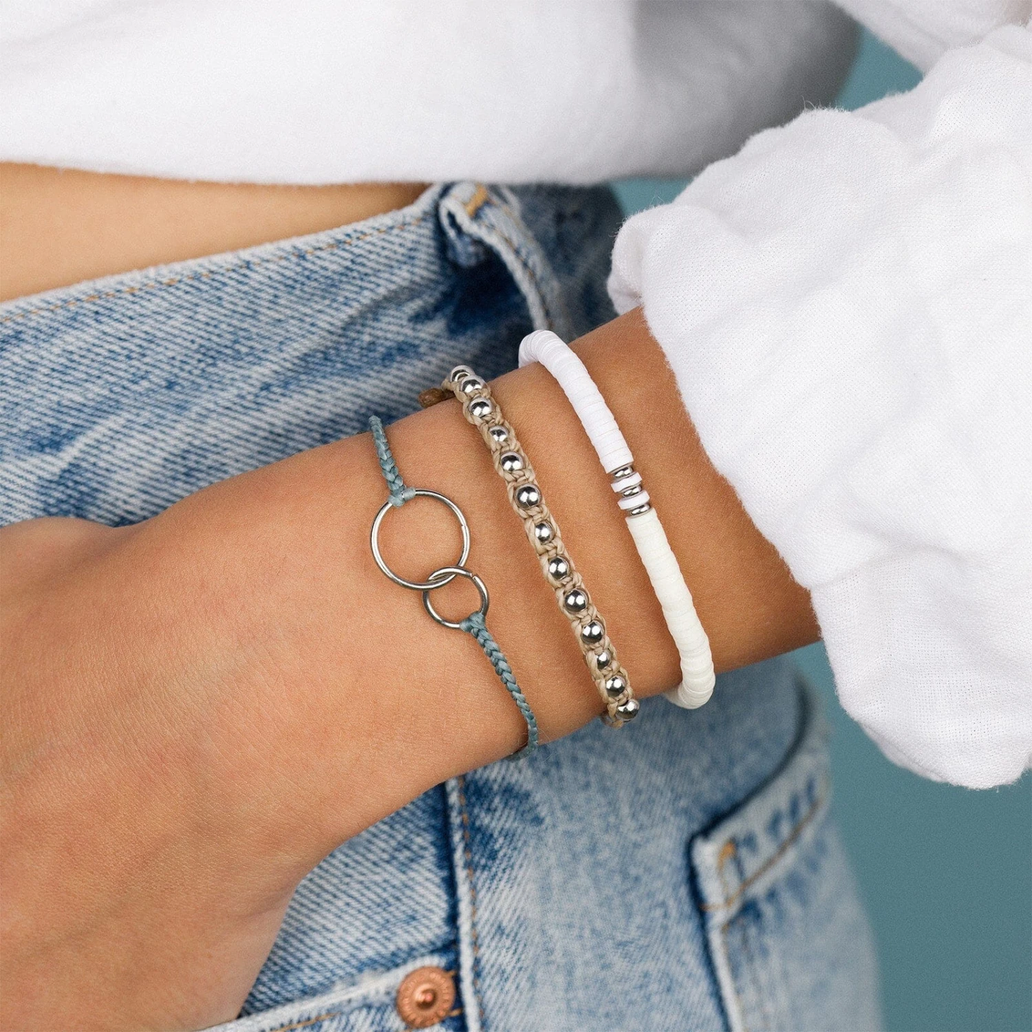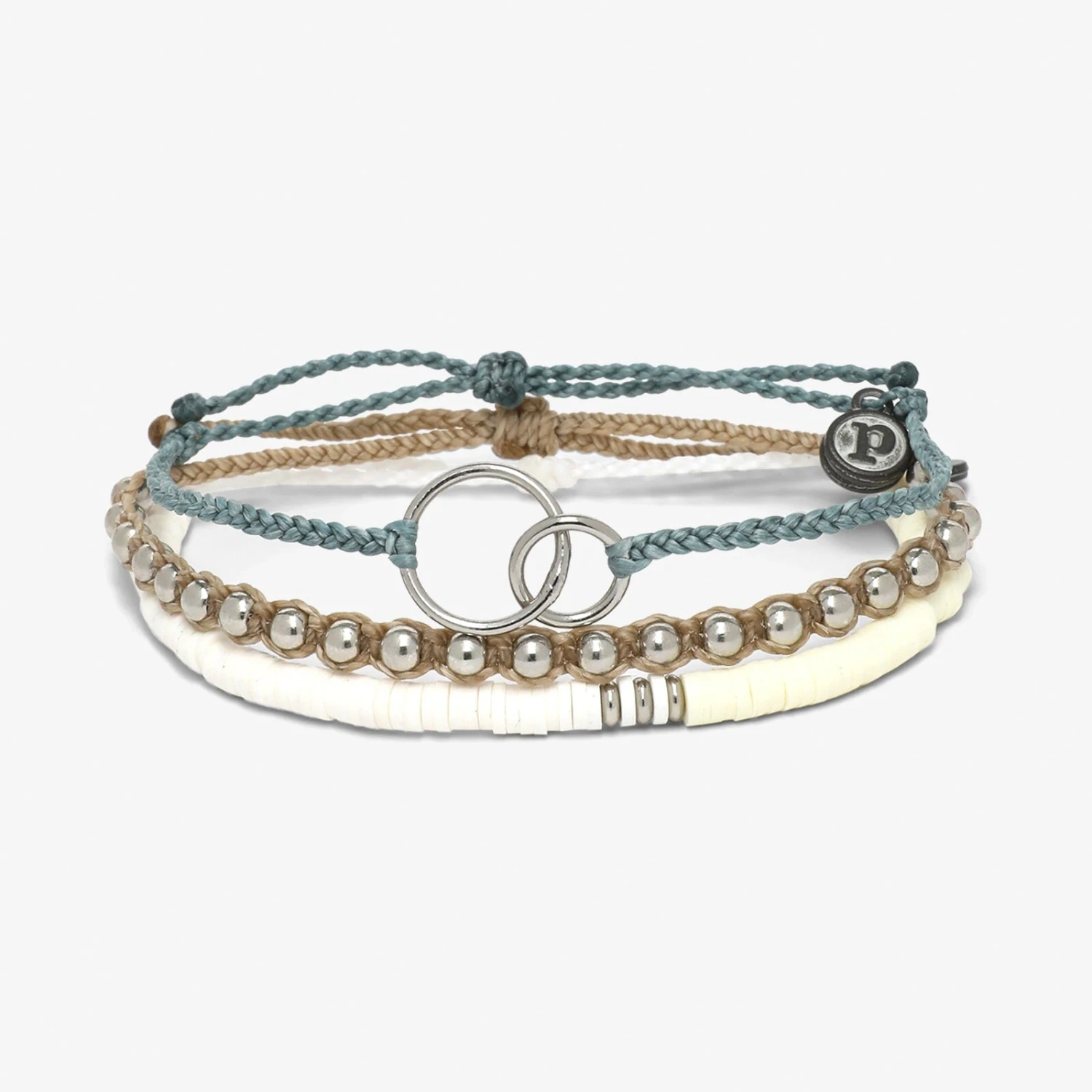 Stacks on stacks! There’s nothing more sophisticated and fun than our Blissed Out Pack. This set includes a linked circle charm bracelet, a metal beaded bracelet and string bracelet with heshi discs. The perfect addition to any outfit!