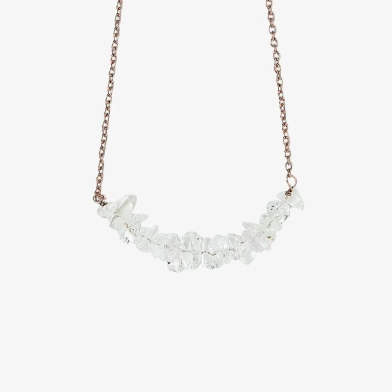 This luxe choker goes with *literally* everything! Clear quartz chips set on a shimmering rose gold chain make this piece perfect for day or night. Every stone is one-of-a-kind and believed to have allll the healing powers. The adjustable chain offers 3 length options for any neckline or season.