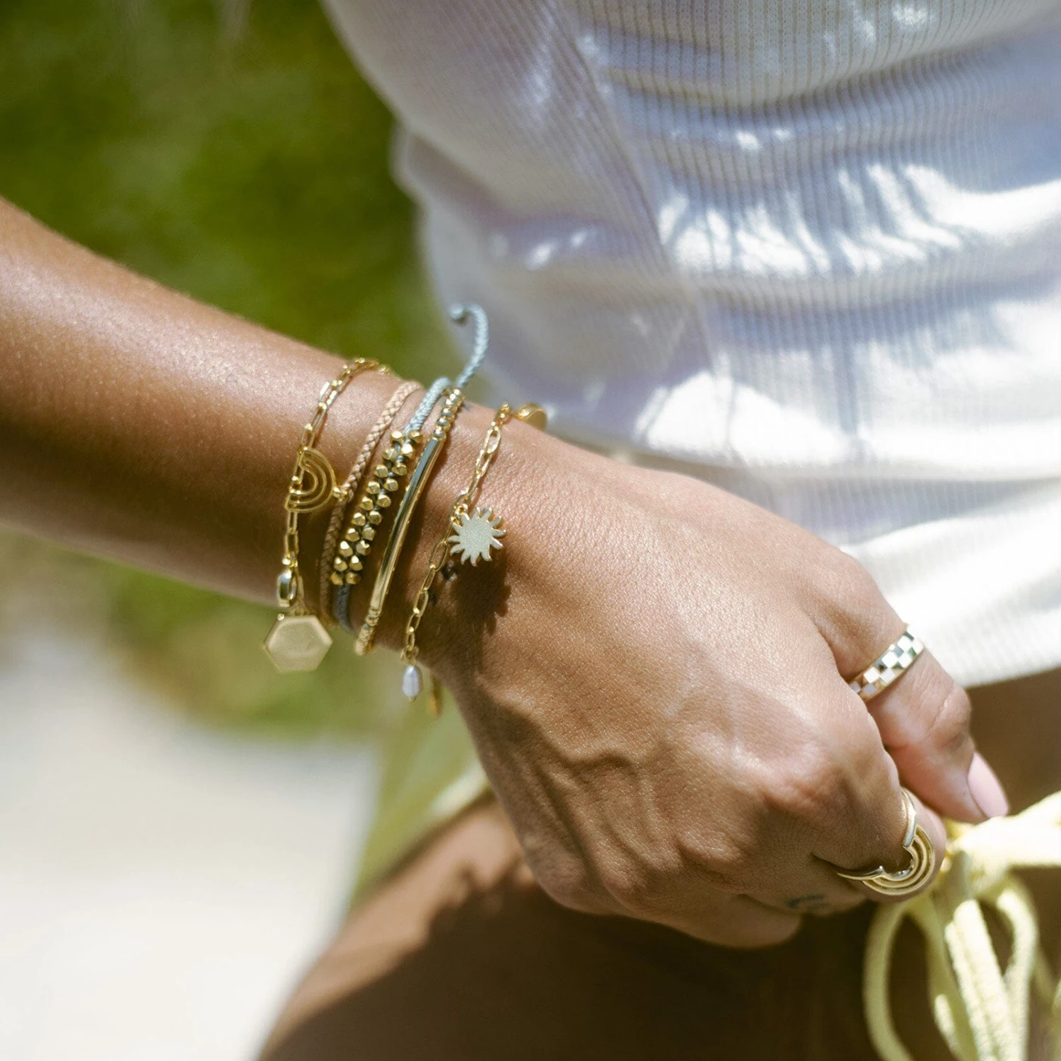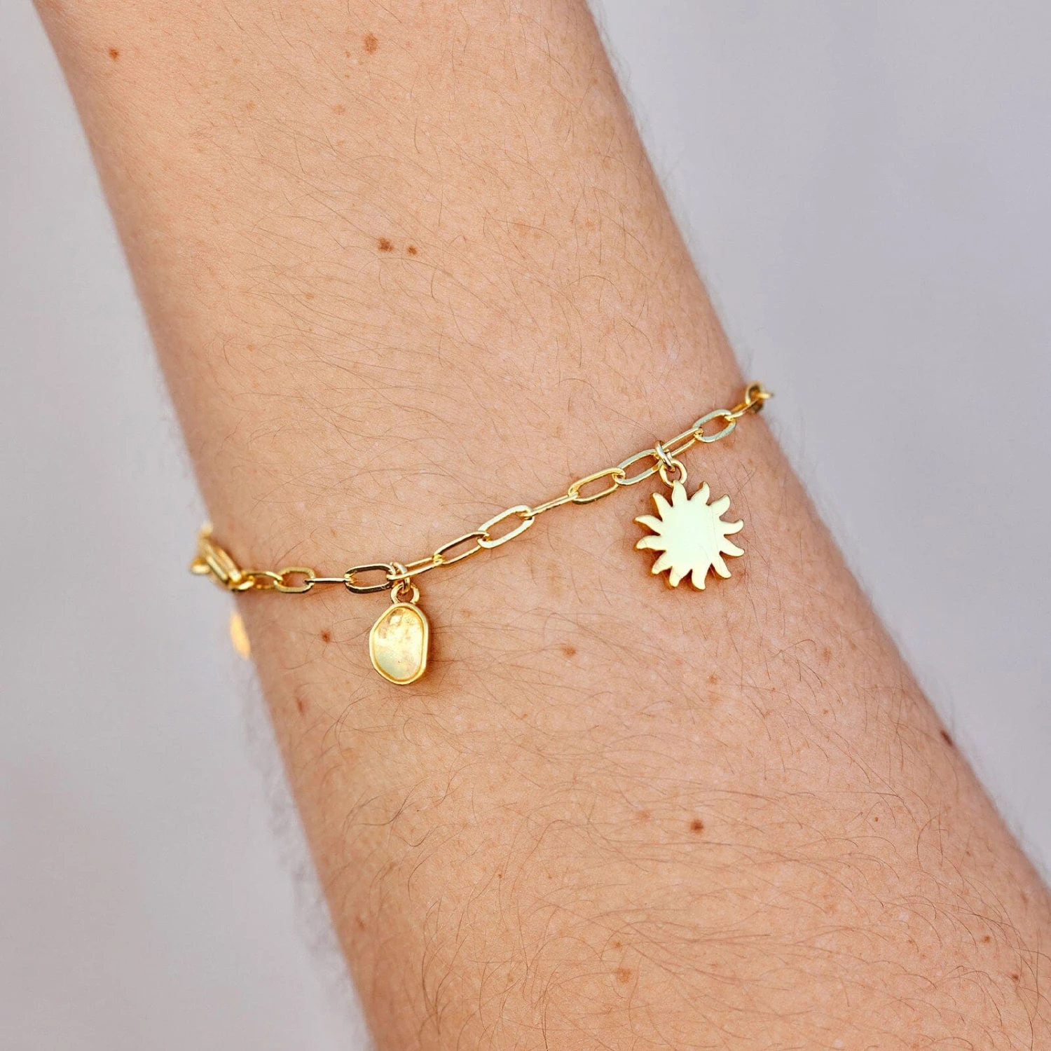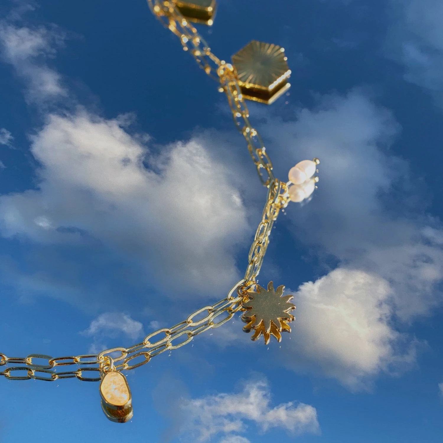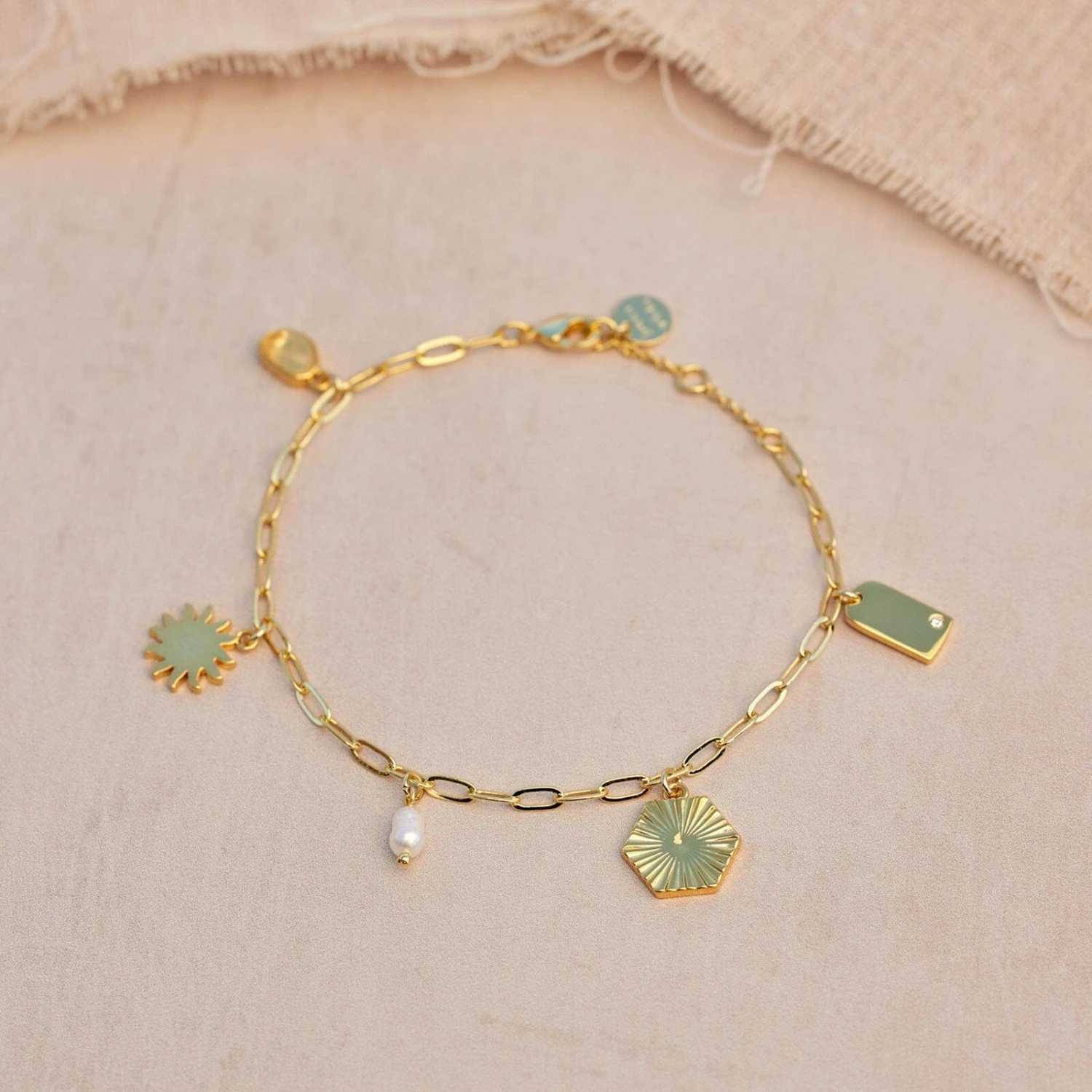 Shine like a golden goddess in our Fortune Charm Bracelet. This luxe open-link design features five gorgeous charms with elevated details like a natural quartz stone, a pretty pearl bead and intricate etching.