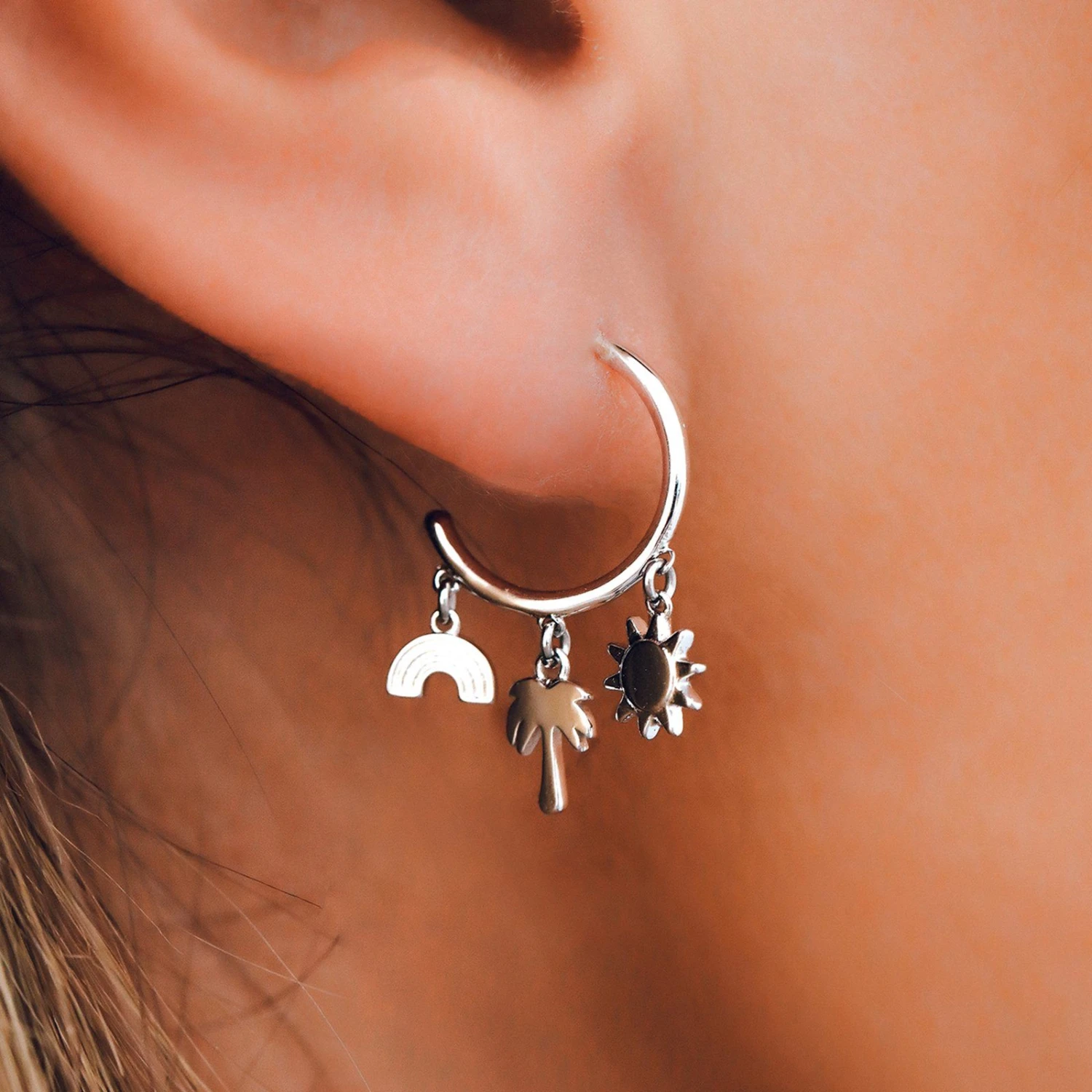 Rep your own piece of paradise with our Maui Charms Huggies. These silver hoops feature a trio of dangling sun, palm tree and rainbow charms. Match it back to our Maui Charms Bracelet and Anklet to make every day feel like vacay.