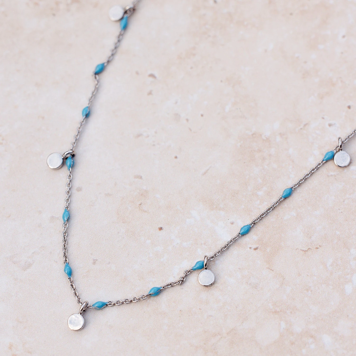 The skies are blue and so is this extra dainty Mini Coin Beaded Choker! Featuring a delicate chain, turquoise beads and silver mini coins, this choker is a must-have for any season.