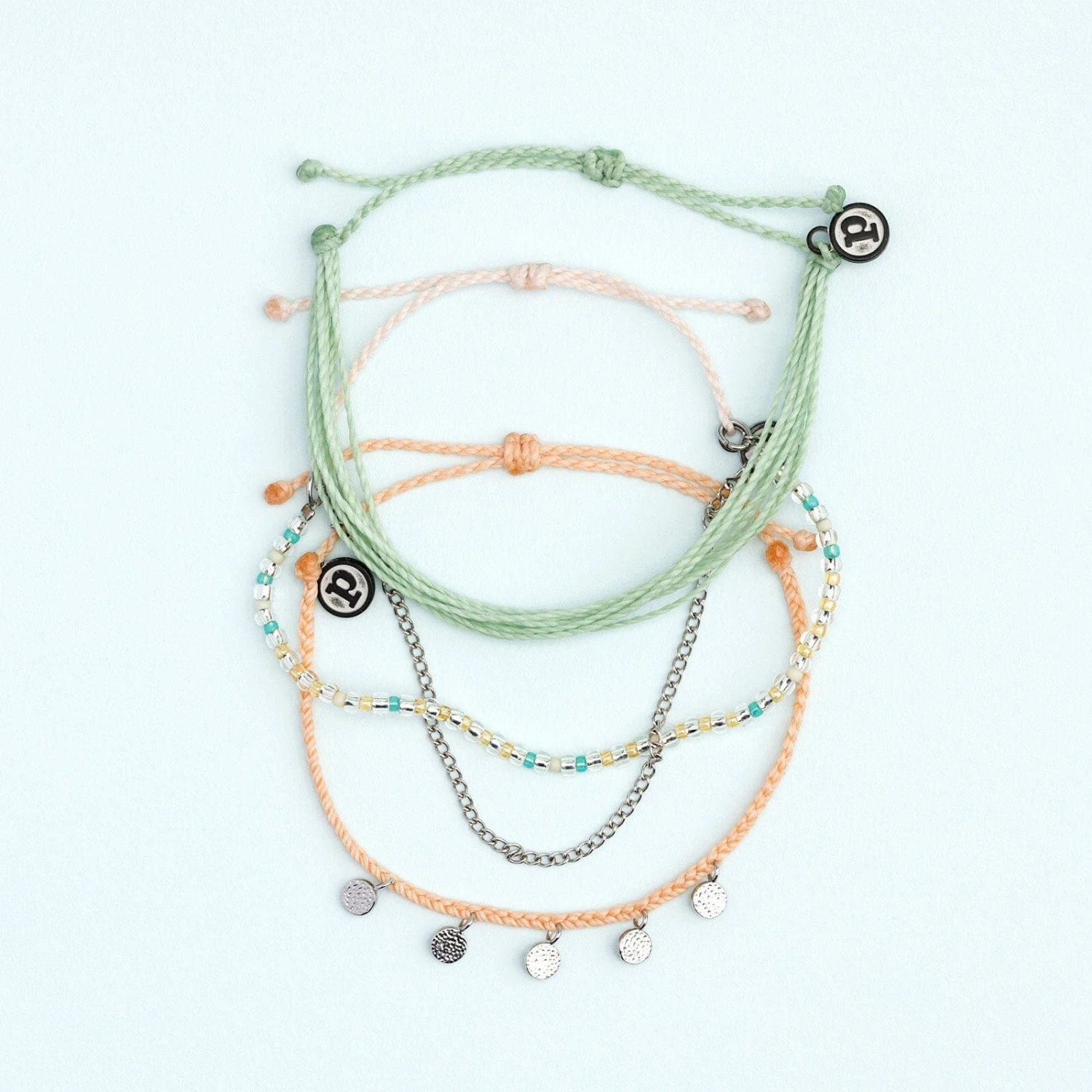 Our Mint Muse is oh-so dainty and delicate! Featuring a mini coin bracelet, chain and bead bracelet and minty green original bracelet, this stack will be the perfect additional to any fit!