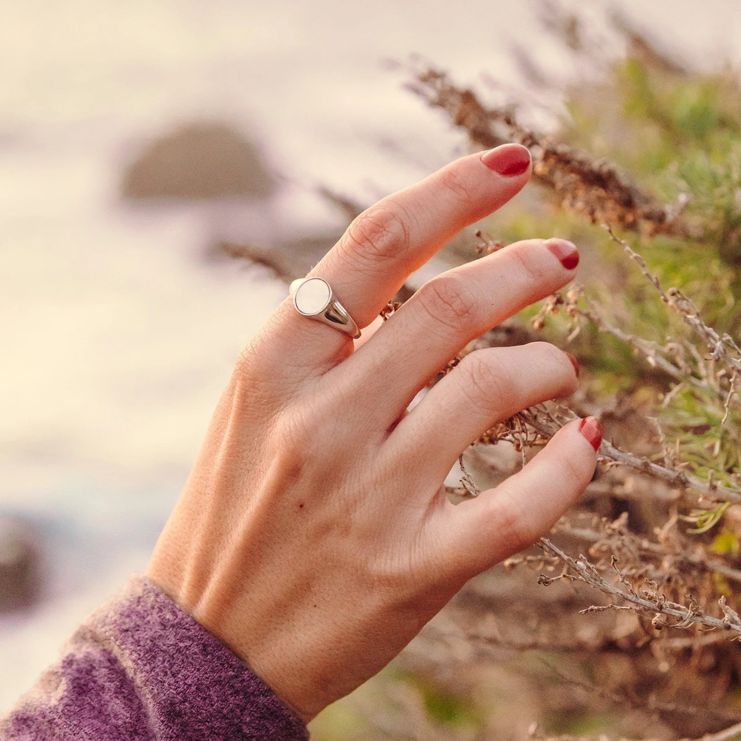 It doesn’t get any chicer than our Mother of Pearl Signet Ring. This classic, feminine style comes in silver and rose gold finishes, and features a timeless signet design filled with a shimmering Mother of Pearl stone. Each stone is 100% genuine which makes every ring one-of-a-kind!