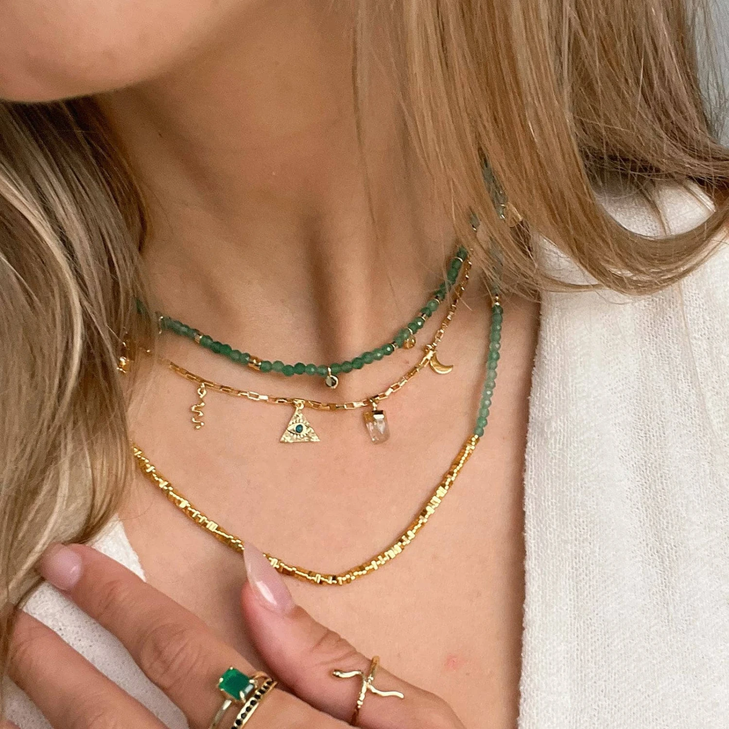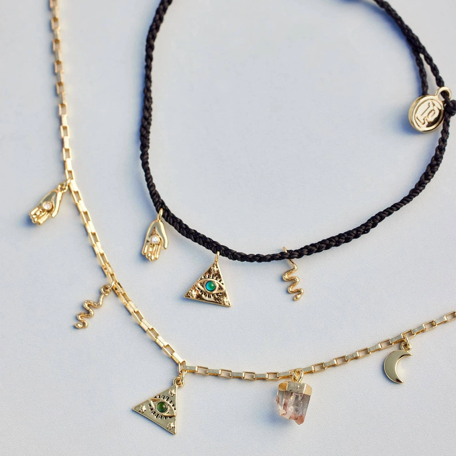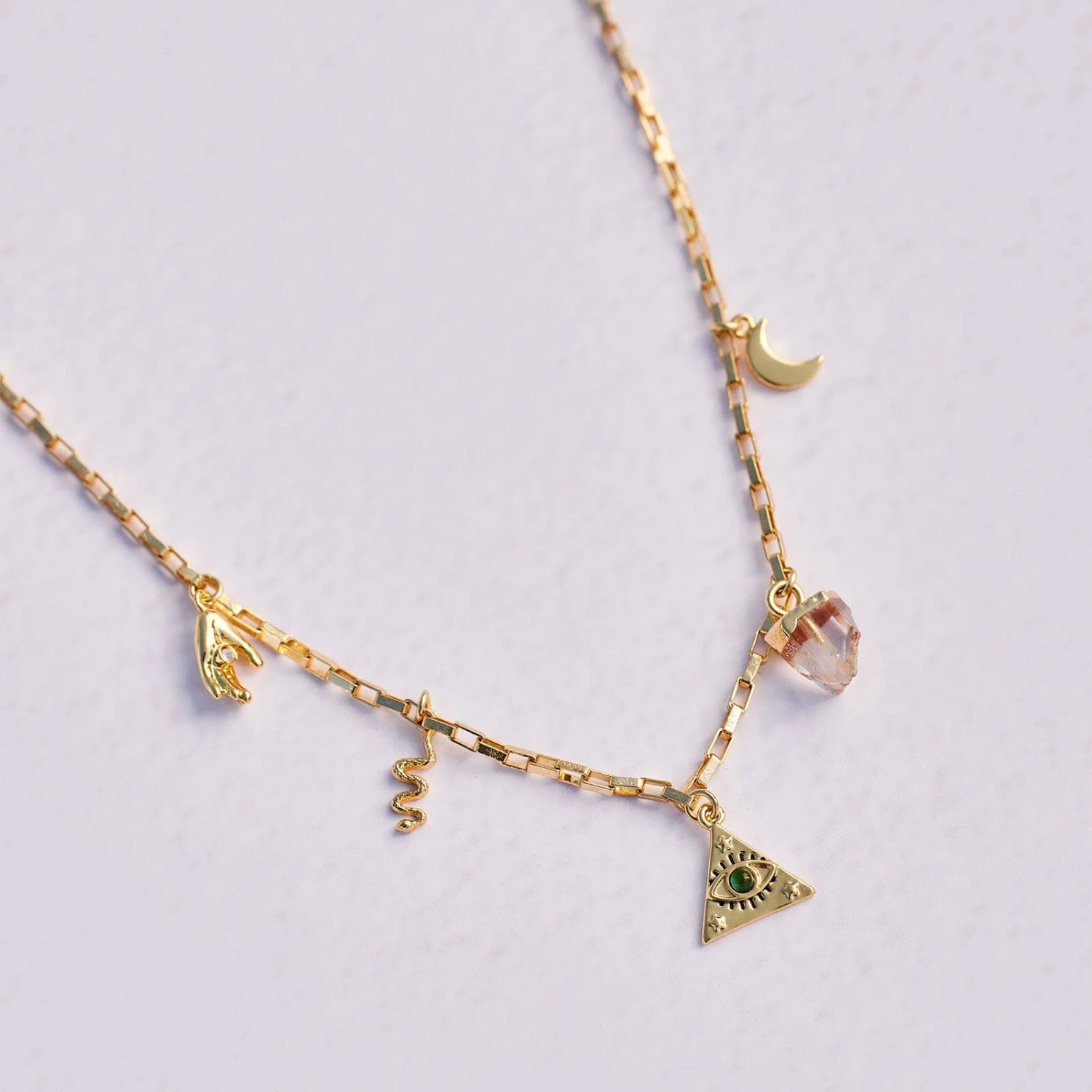 Old world meets modern mystic with the protective charms donned from a gold-plated paper clip chain. This charming piece includes a clear glass stone bezel-set into a hand, a mood triangle, a snake, a moon, and an electroplated quartz stone that’s unique to *your* necklace.
