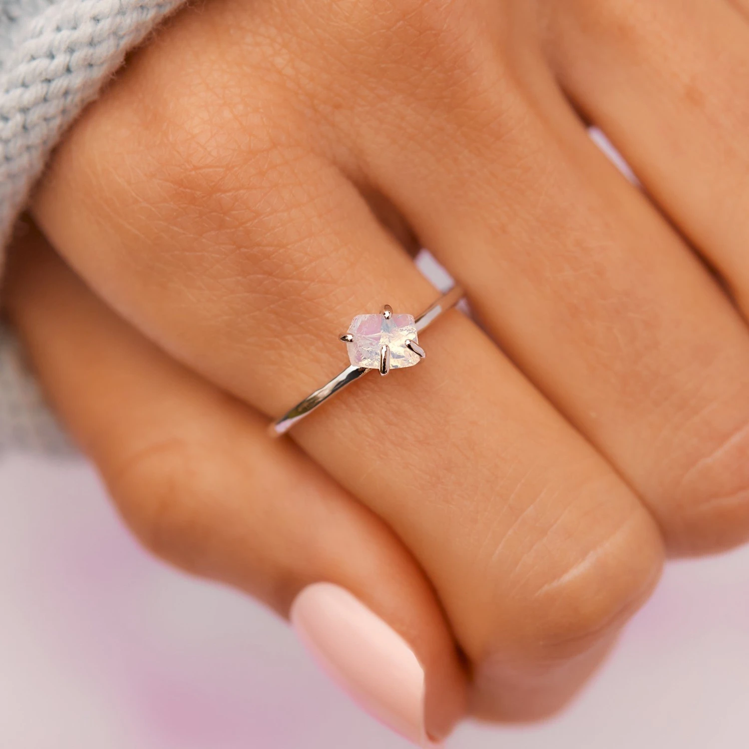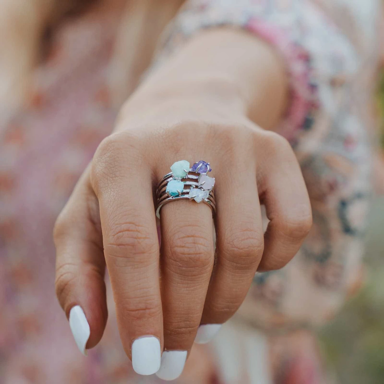 Bring the good vibes wherever you go with this simple yet chic Raw Gemstone Ring! This sleek silver look comes in five gorgeous gemstones – amazonite, amethyst, moonstone, rose quartz and turquoise – that each exude a different vibe. And because each stone is 100% unique, no two look alike!