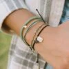 An effortless added touch that instantly elevates the rest of your bracelet canvas, this string piece is available in a stunning heather green with understated gold and stone accents throughout.