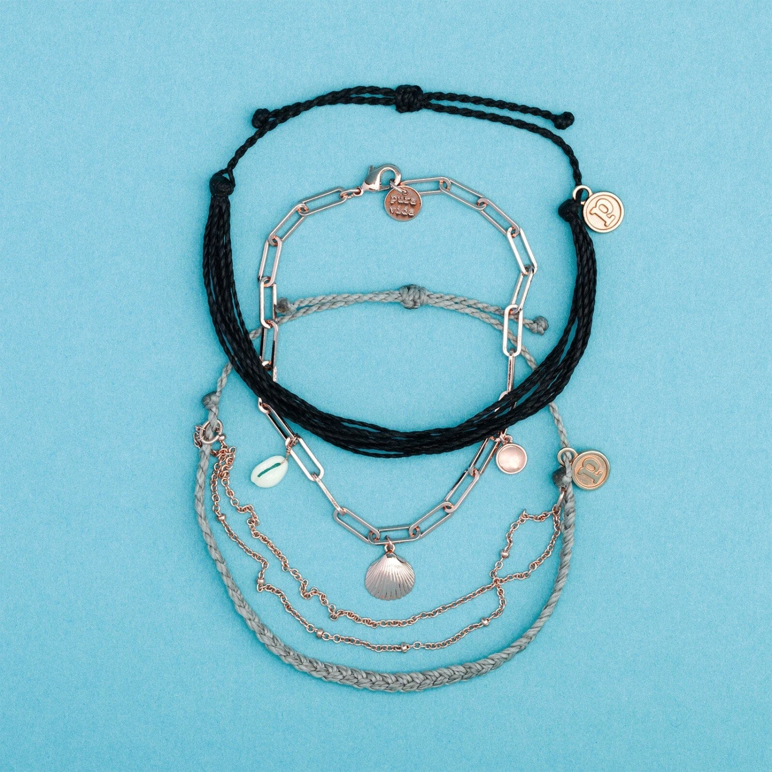 silver bitty braid with rose gold chain, a paperclip chain bracelet featuring beach-worthy charms, and our best selling black Original style.