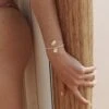 Don’t let another day end without wearing our Sundown Charm Bracelet. This dainty design is set on a braided band the color of sand dollars, and features a dangling tag charm etched with a scene of the sun setting over the ocean.