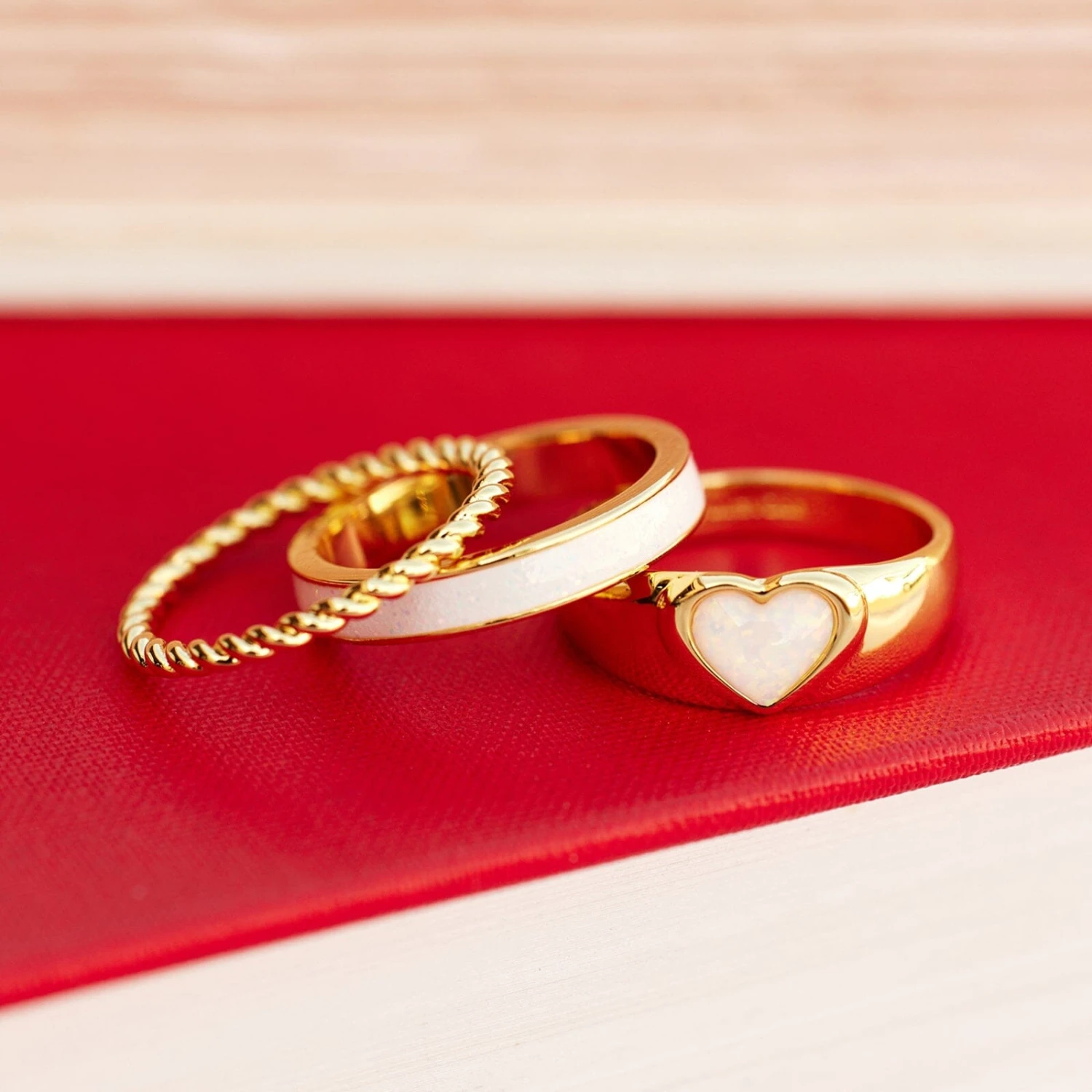 Roses are red, violets are blue, our Twisted Love Ring Set is the one for you! This trio of stunning styles includes a twisted rope band, opal resin design, and a signet-inspired style with an opal-filled heart accent. Stack ‘em all on one finger, spread ‘em out, or wear ‘em one at a time for a simple-but-chic look.
